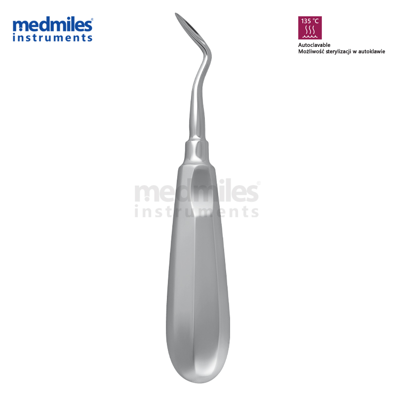 • Prawostronnie wygięte, ostro zakończone ostrze dopasowuje się do anatomii korzeni, zapewniając precyzyjną dźwignię przy minimalnym urazie kości.