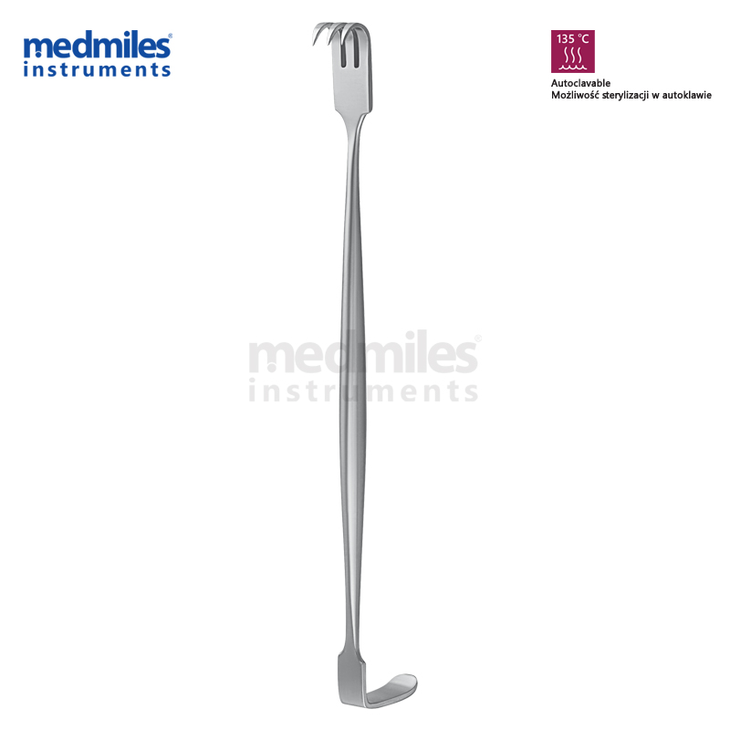 • Konstrukcja obustronna: jedna strona z hakami trzyzębnymi o wymiarach 8 mm × 7 mm, druga strona z ostrzem Moberg o wymiarach 6 mm × 20 mm, umożliwiające wszechstronne odciąganie.